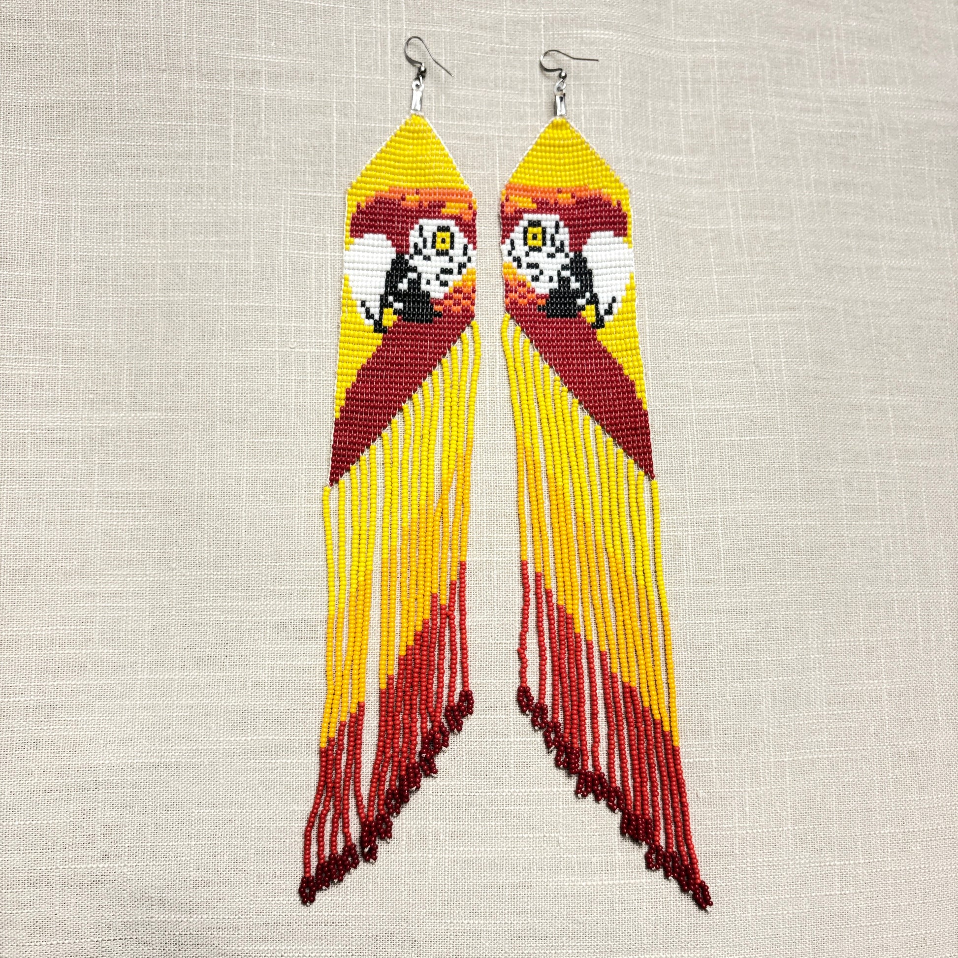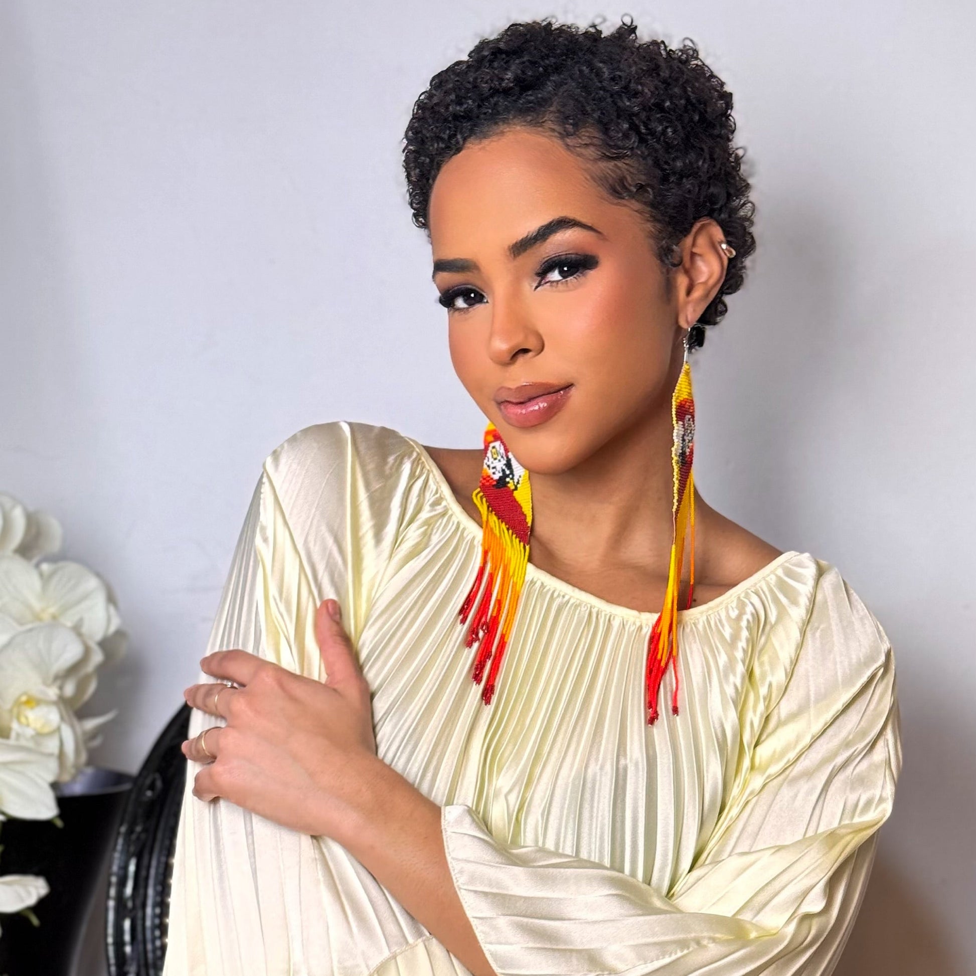 Ces boucles d’oreilles en perles de verre reprennent les couleurs vibrantes de l’ara rouge, oiseau emblématique de l’Amazonie. Le mélange du rouge intense sur fond jaune crée un motif lumineux, énergique et élégant. Leur design fin et léger illumine instantanément le visage, ajoutant une touche de couleur raffinée à n’importe quelle tenue, du style casual au look plus habillé.