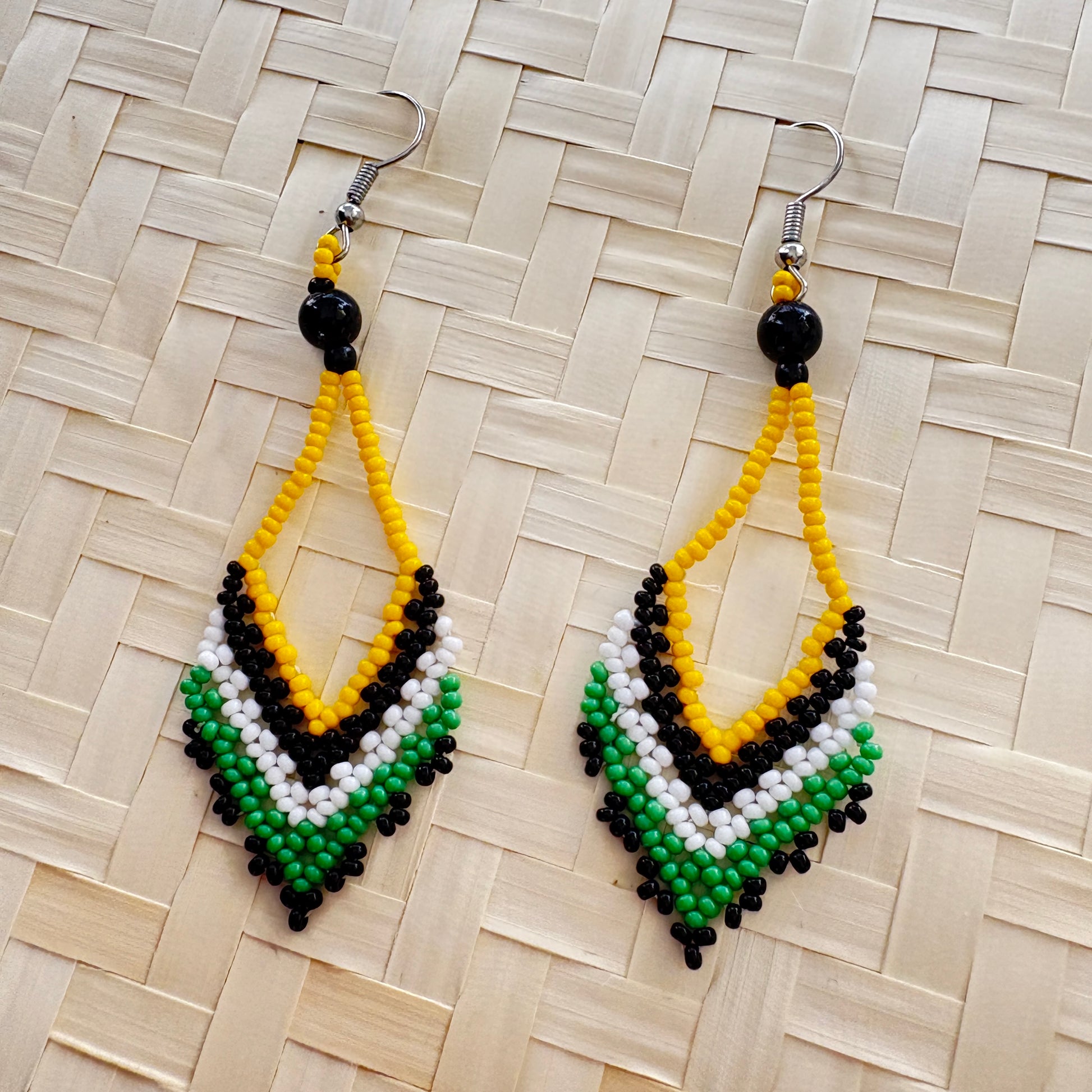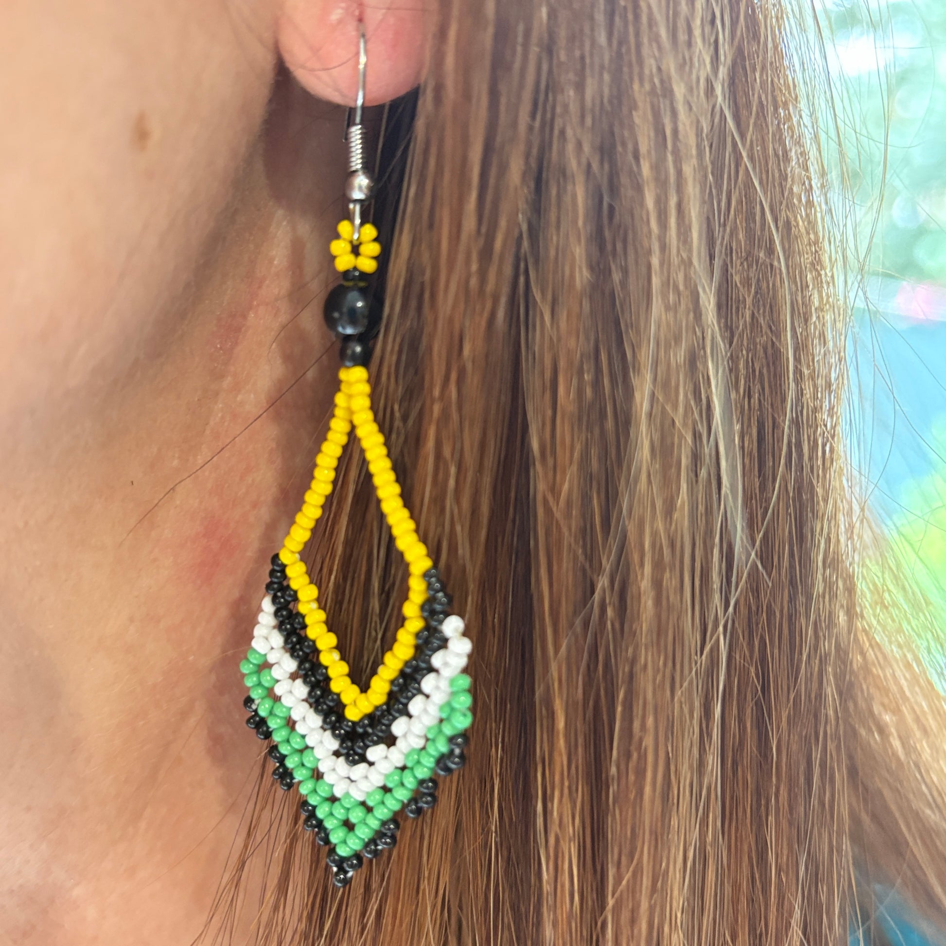 Ces boucles d’oreilles en perles de verre sont de véritables accents de lumière pour votre visage. Leur forme géométrique et leurs couleurs contrastées apportent du caractère à une tenue simple. Portez-les avec un t-shirt blanc, une chemise noire ou une robe beige pour faire ressortir l’intensité du jaune et la finesse artisanale des perles de verre (miçanga).