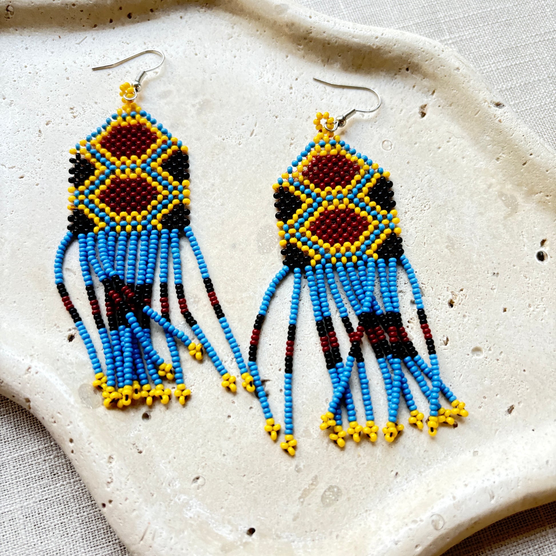 Optez pour une tenue dans des tons neutres — noir, beige ou écru — afin de mettre en valeur la palette vibrante de couleurs et les motifs de ces boucles. Elles deviendront instantanément le point focal de votre look.