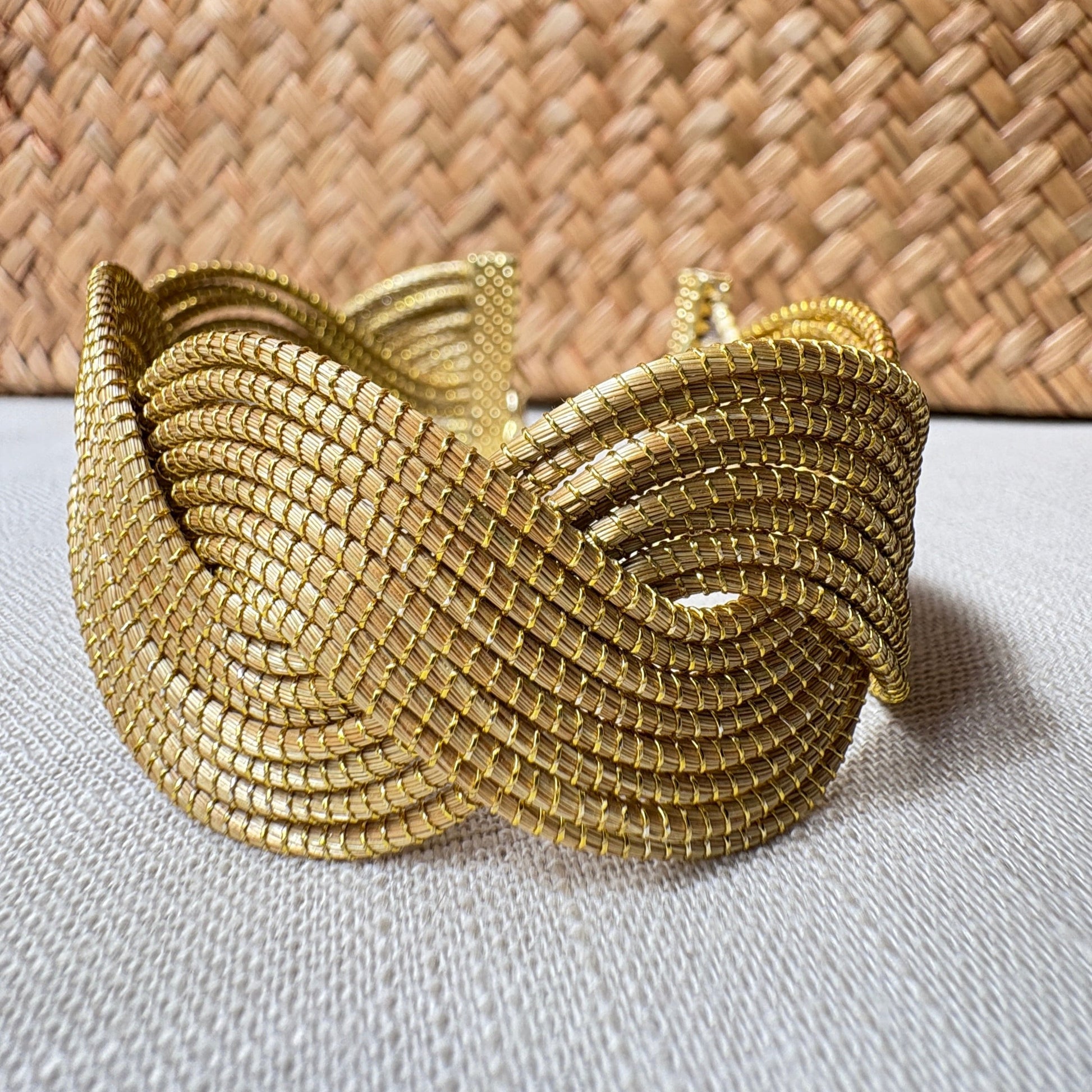 Ce bracelet large en Capim Dourado au motif entrelacé artisanal apporte une touche d’authenticité et de sophistication à votre poignet.
