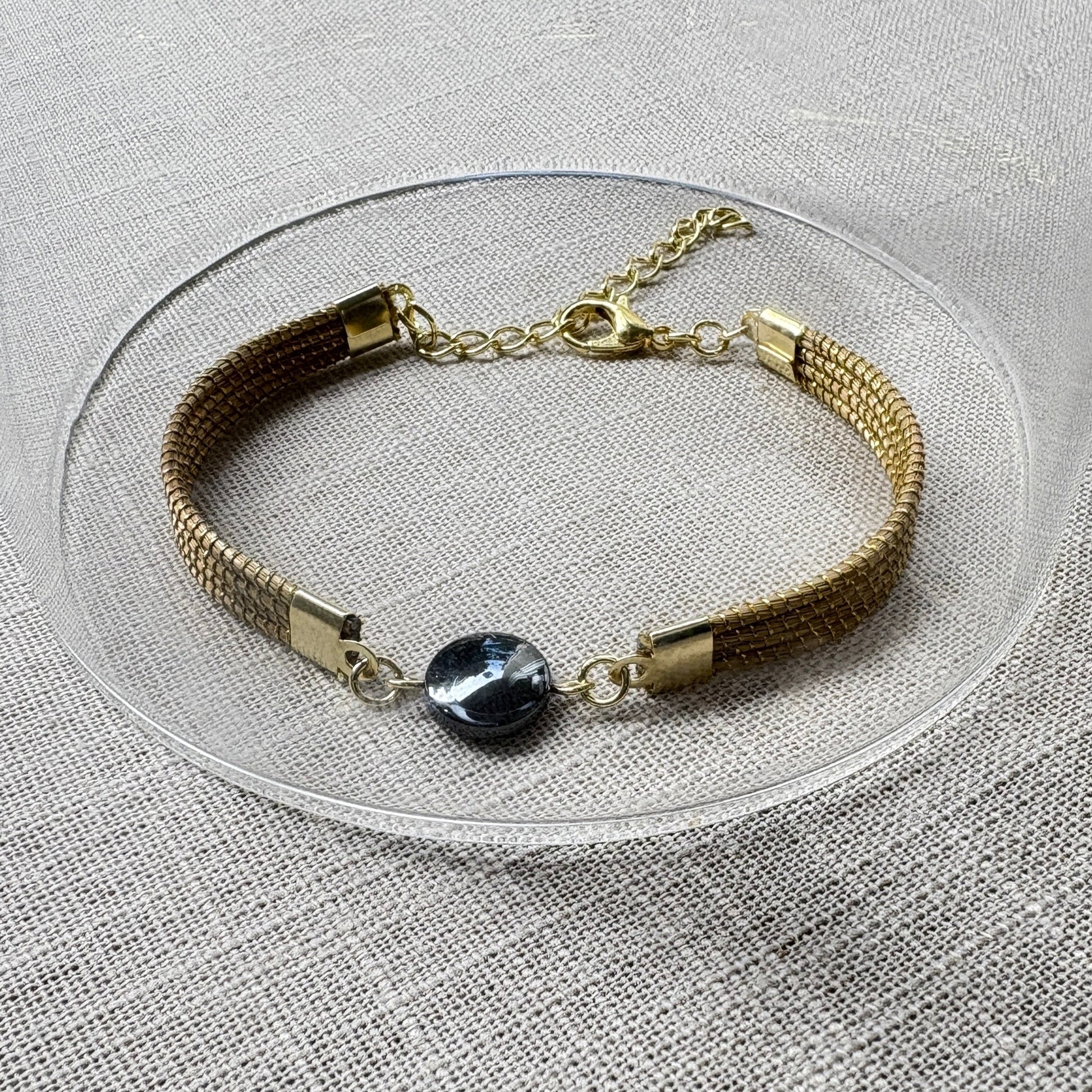 Ce bracelet en Capim Dourado, orné d’une pierre naturelle d’Hématite, joue sur les contrastes entre éclat doré et reflets métalliques profonds.