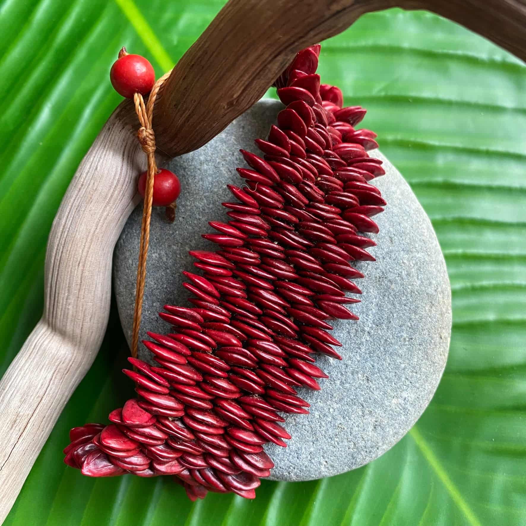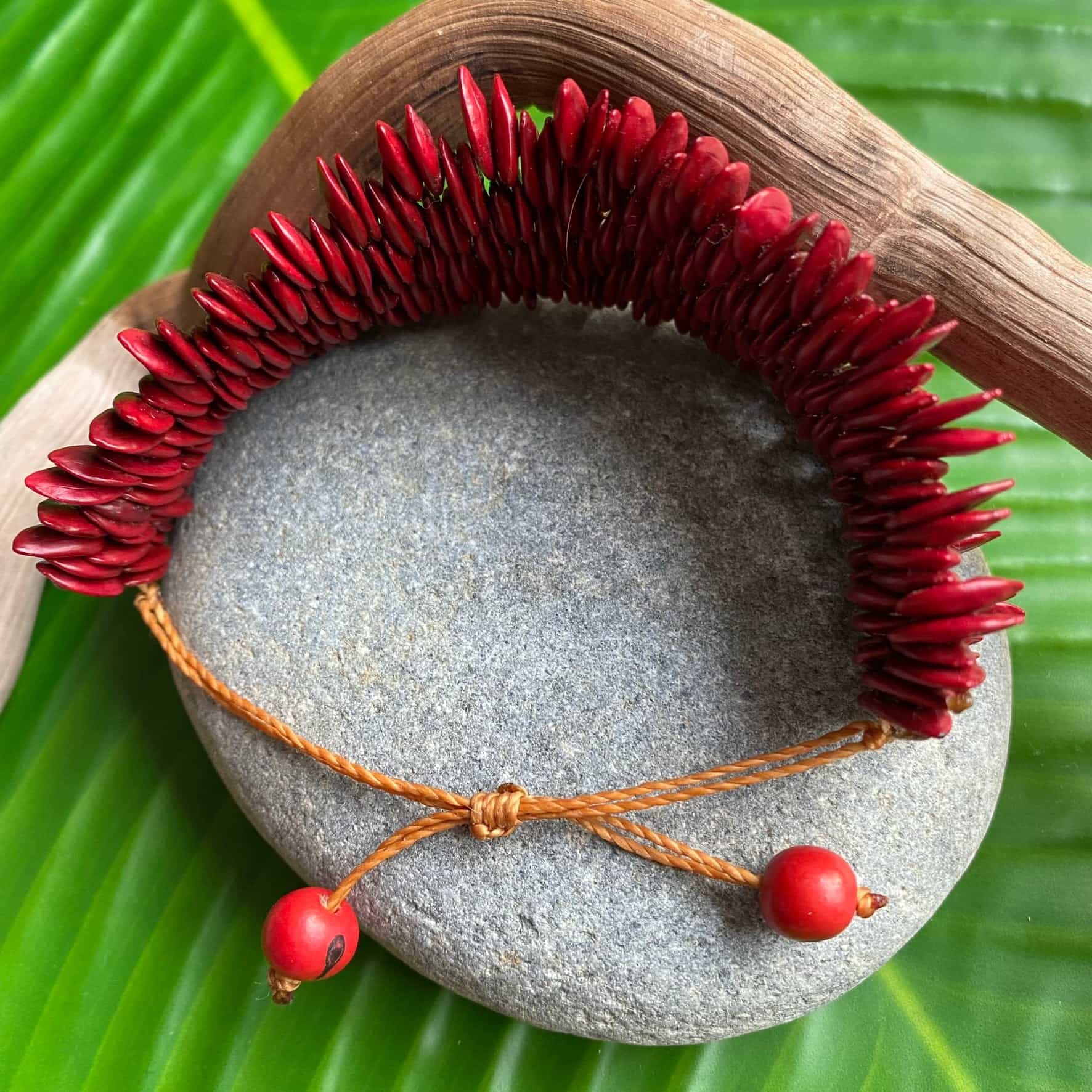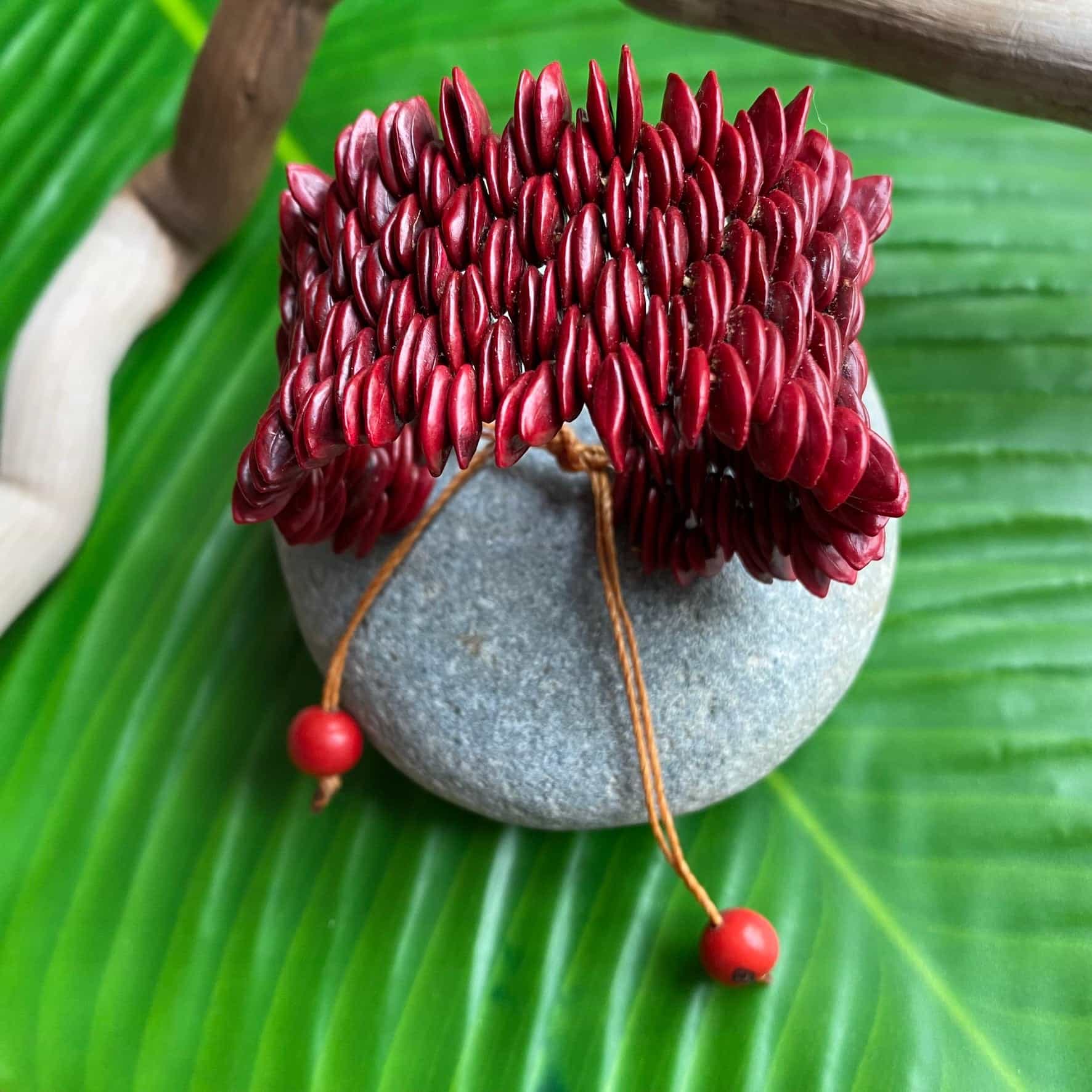 La teinte rouge intense des graines apporte une touche de vitalité et d’énergie à votre poignet, parfait pour relever une tenue sobre (noir, blanc, beige) ou accompagner d’autres accessoires en tons chauds.
