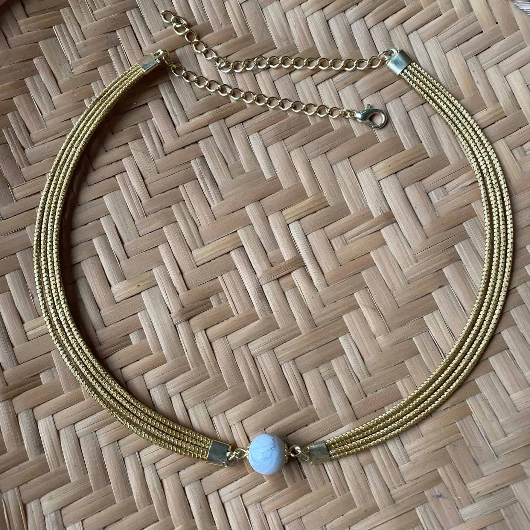 Pour mettre en valeur le ras-de-cou et la howlite raffinée, privilégiez une coiffure élégante et dégagée — chignon bas, queue de cheval sophistiquée ou demi-attachée subtile — afin de diriger le regard vers le bijou.