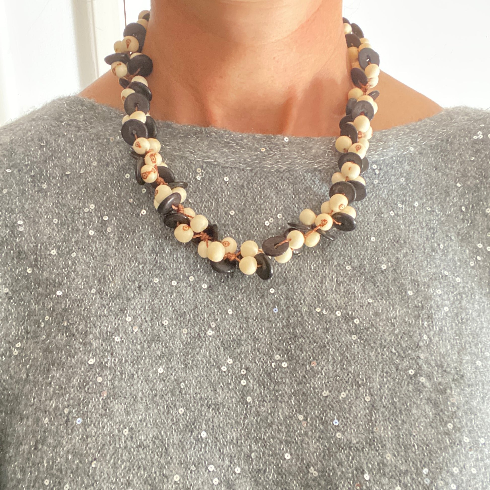 Ce collier aux teintes naturelles s'intègre harmonieusement dans divers styles vestimentaires.