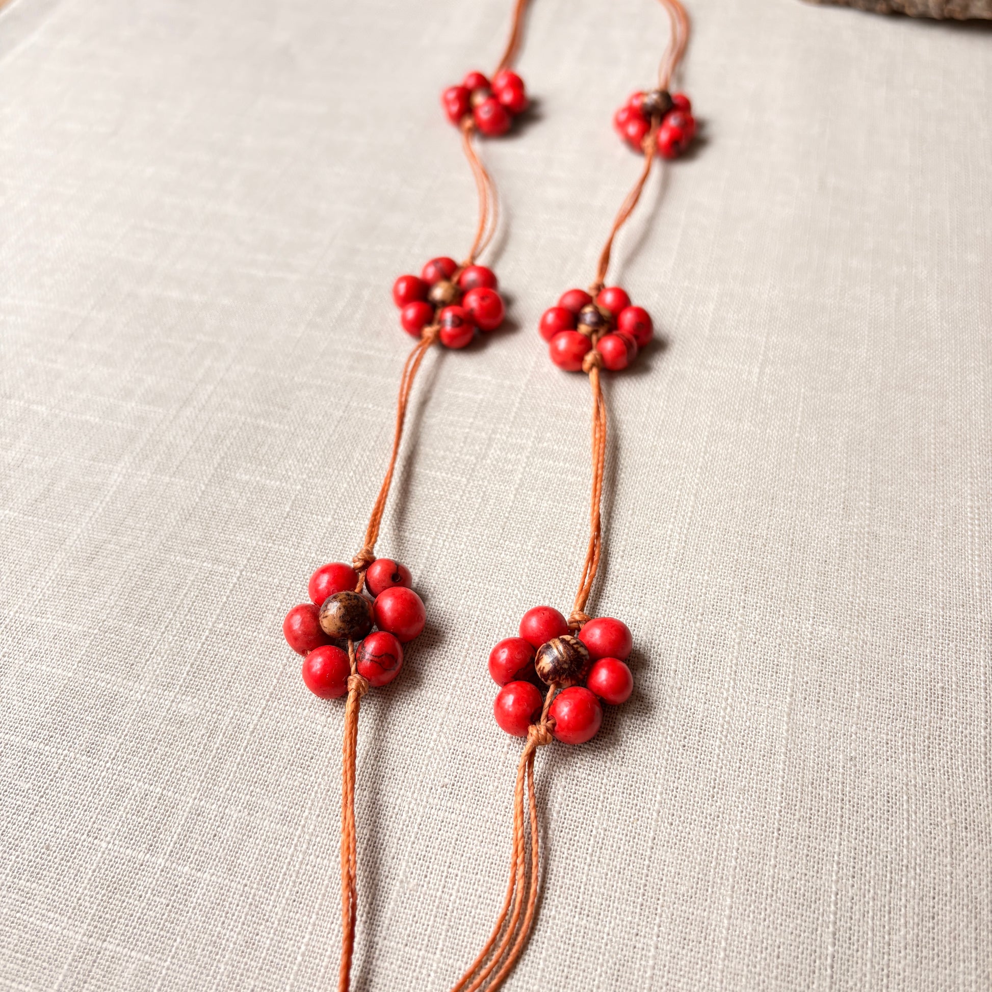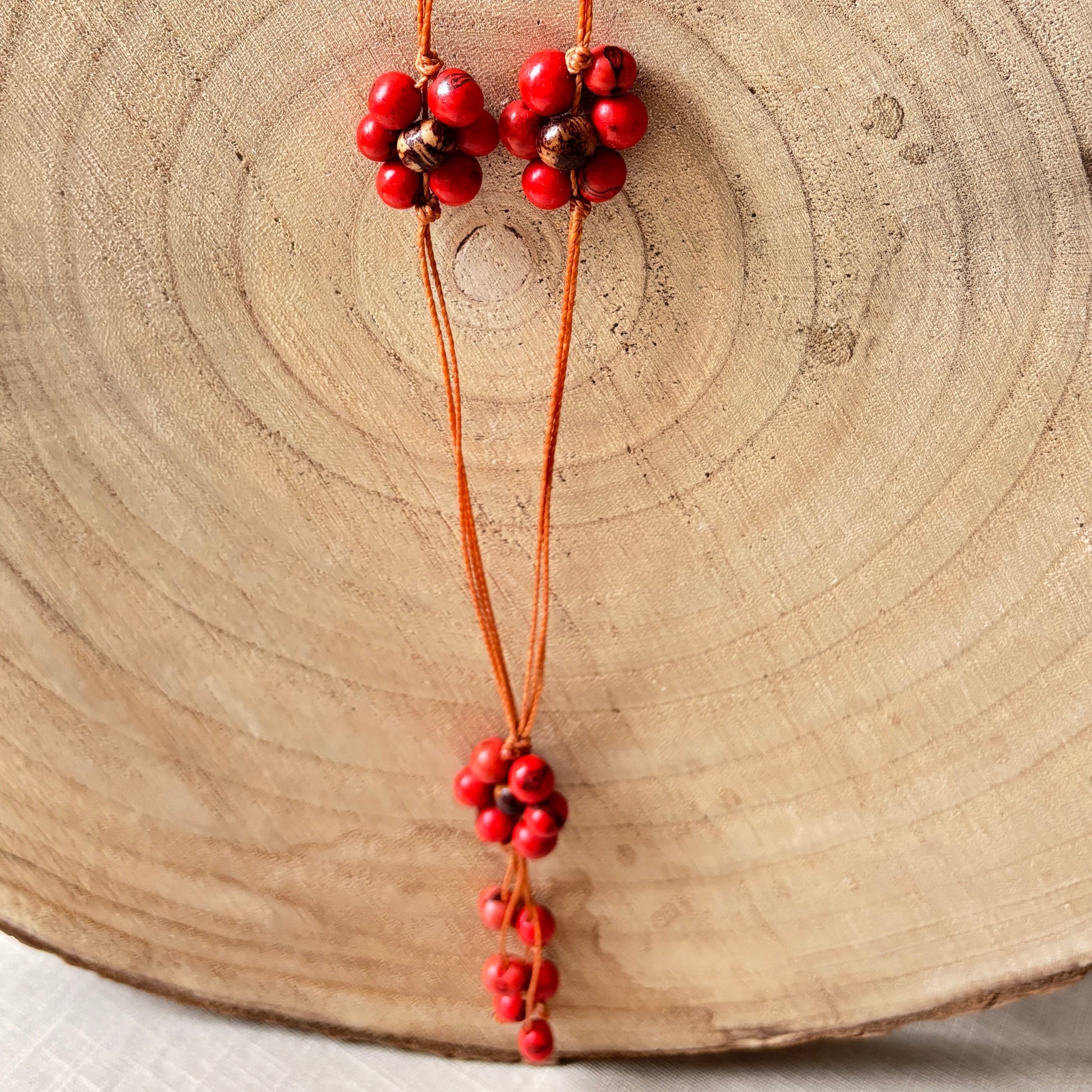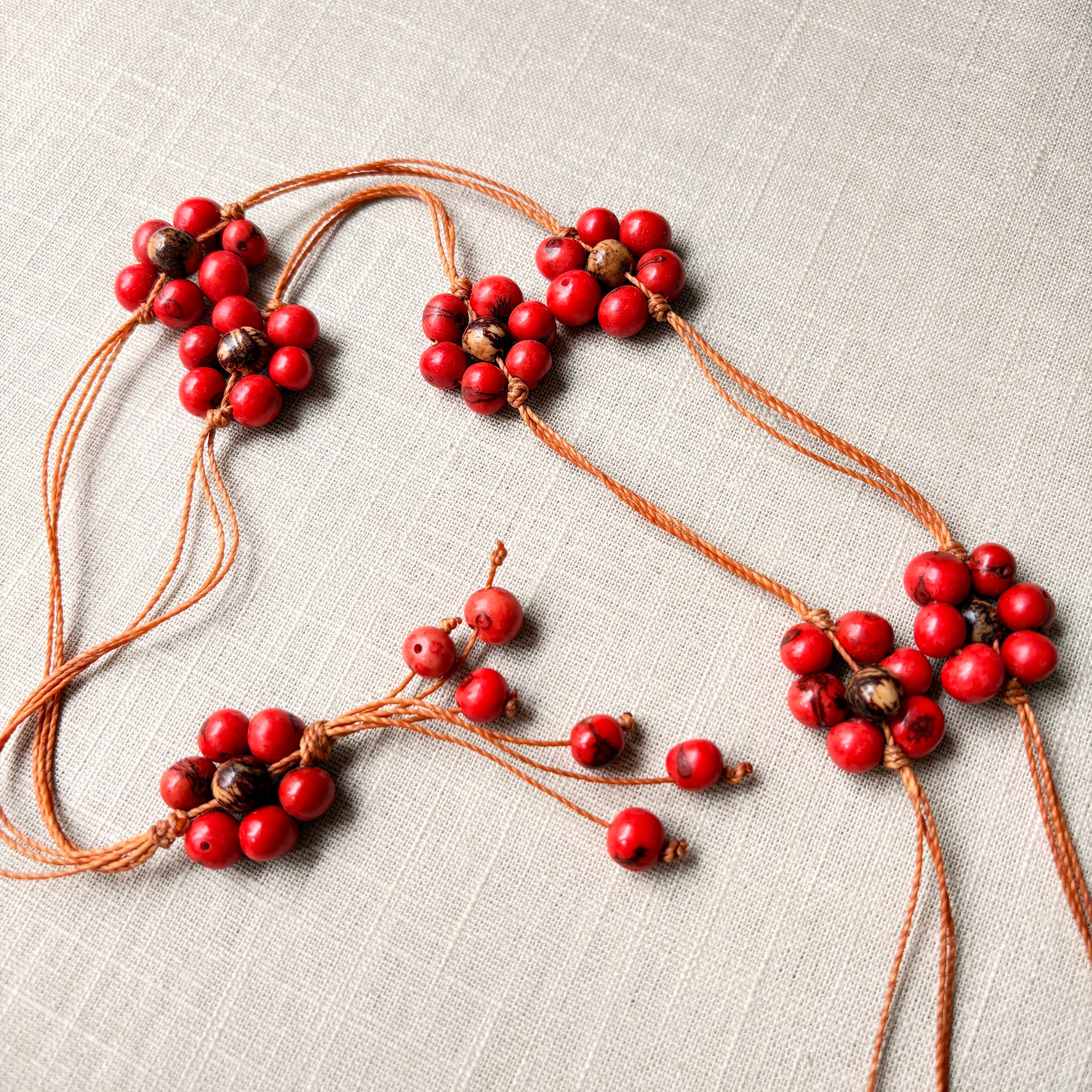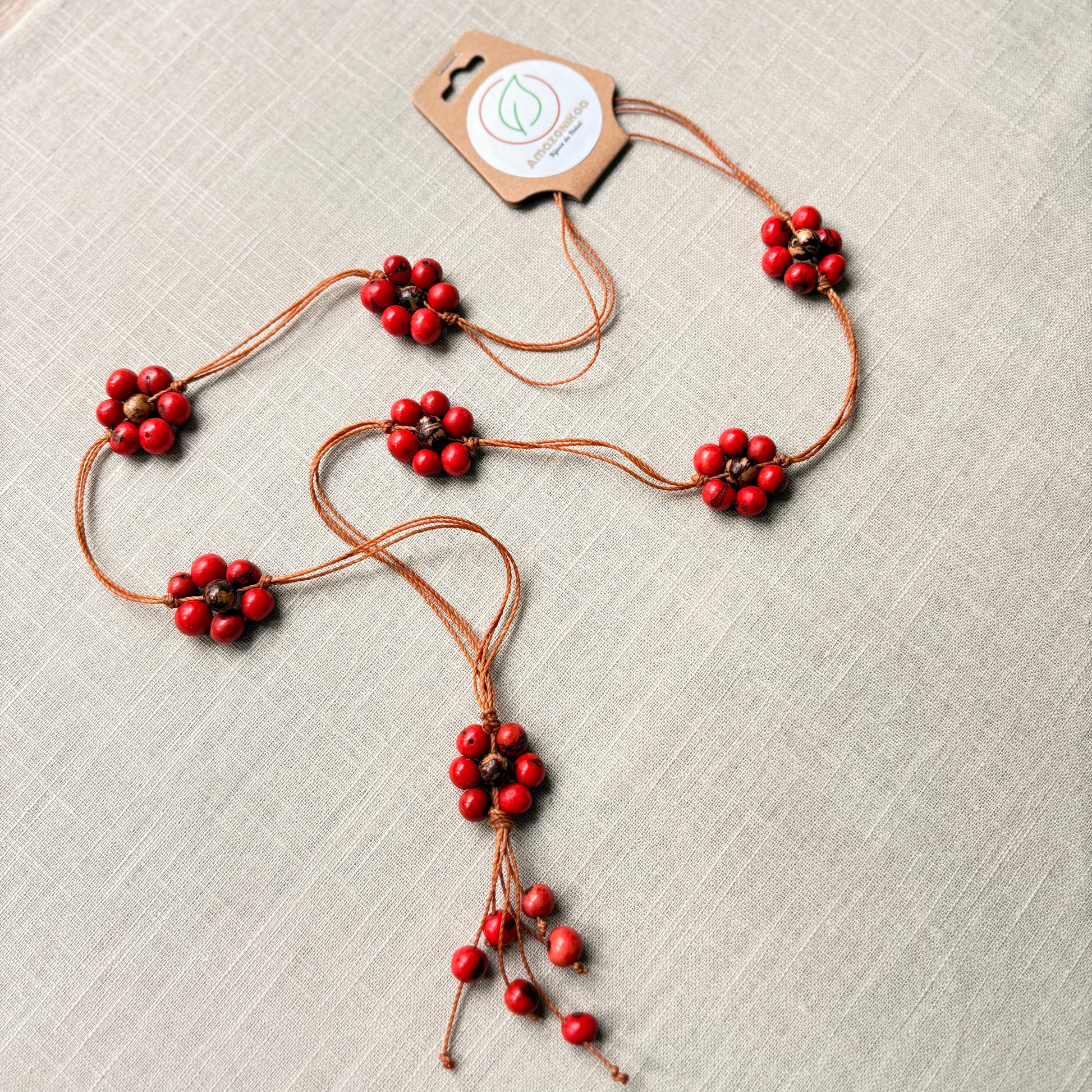 Portez-le sur un haut blanc, un top beige ou une robe fluide en lin pour faire ressortir le rouge éclatant des graines et la finesse du travail artisanal.
