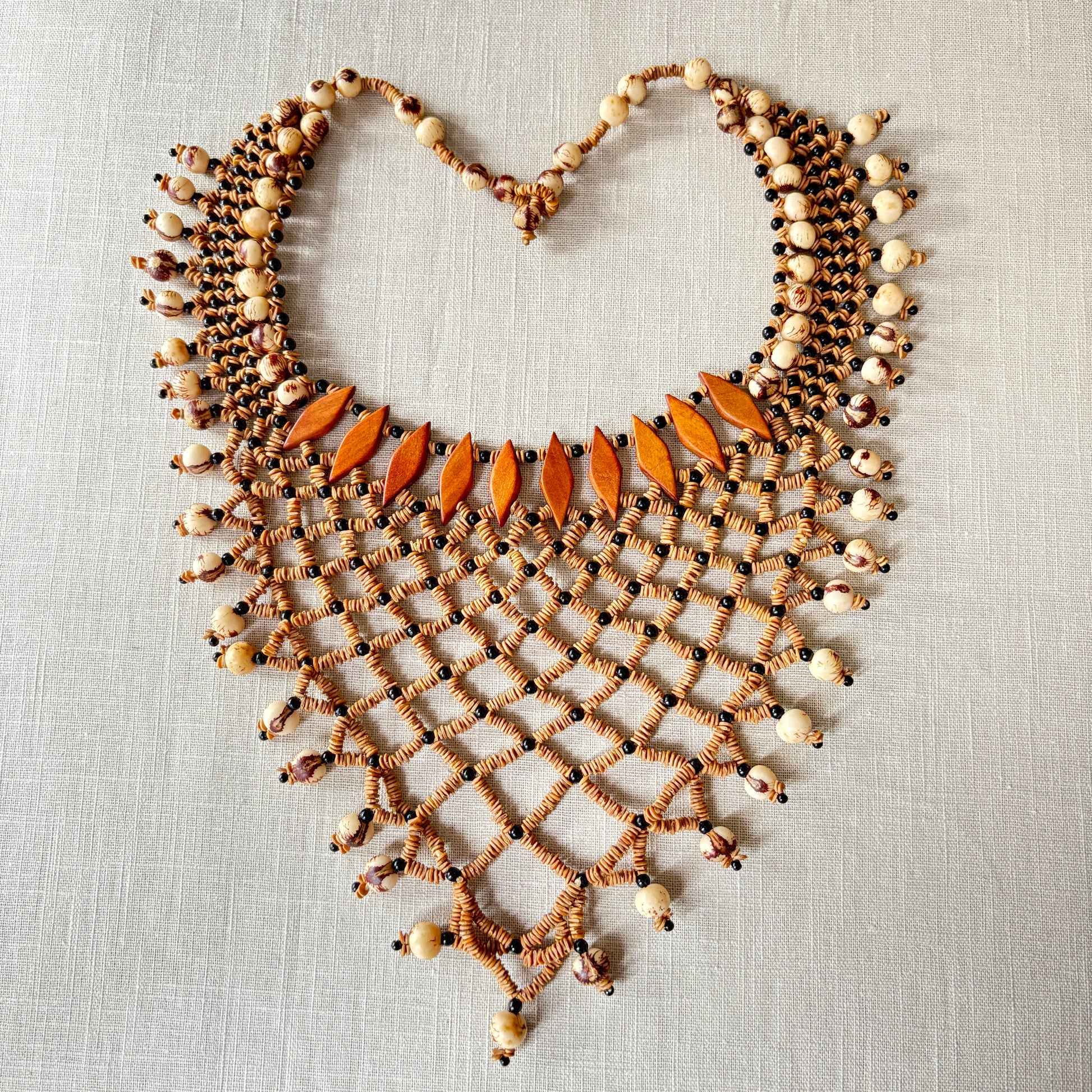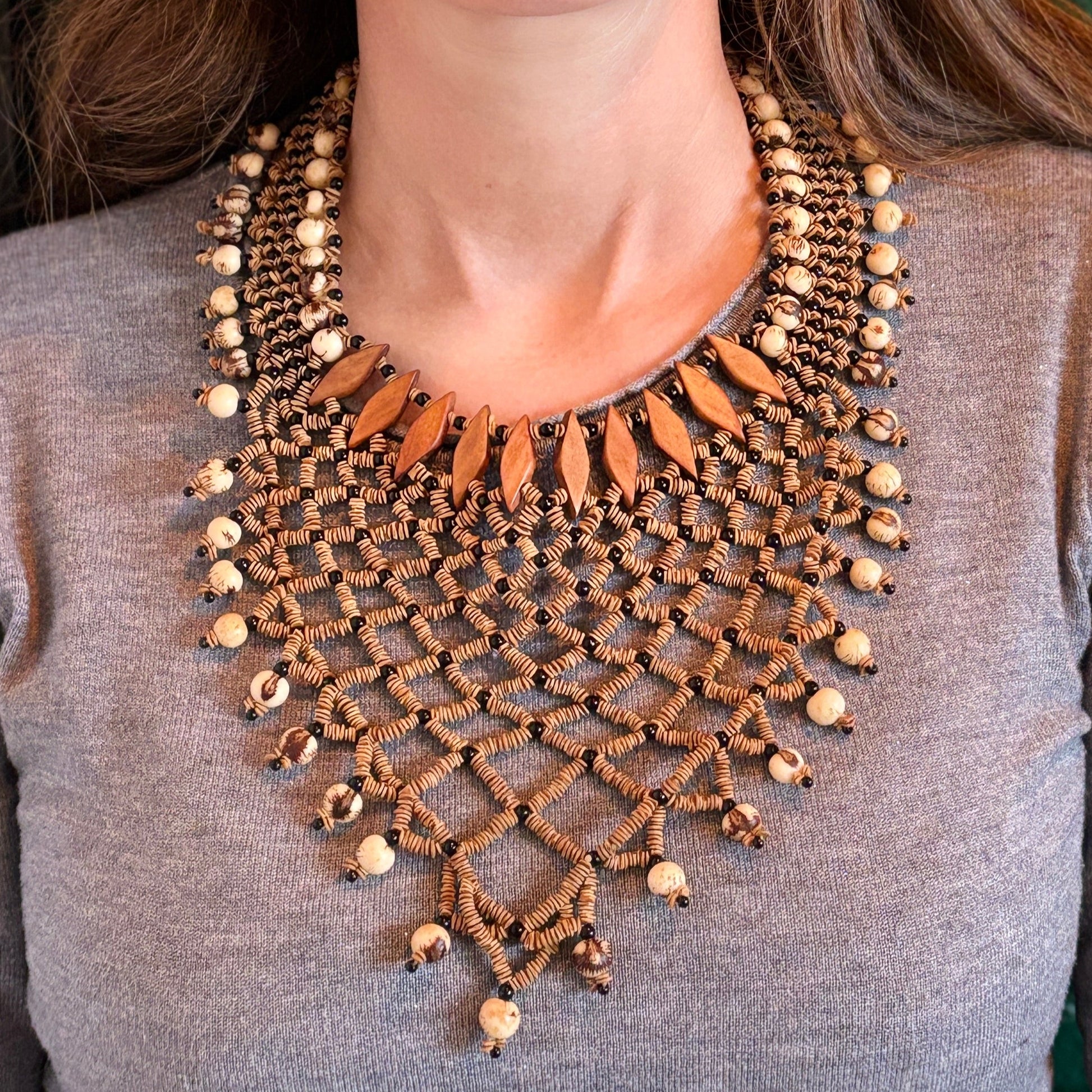 Les graines d’açaï et le bois créent un contraste subtil, facile à associer avec des tenues en fibres naturelles : lin, coton, chanvre. Portez-le sur un haut uni, col rond ou en V, pour laisser parler sa forme et ses textures.