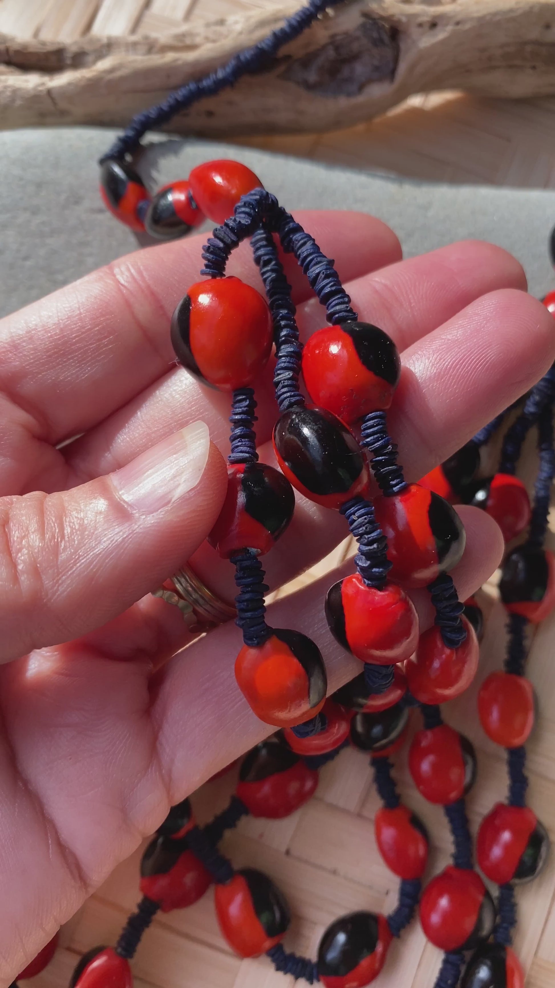 Les contrastes fort de ce collier — noir profond et rouge vibrant — s’épanouissent pleinement sur des tenues sobres (blanc cassé, beige clair, gris doux) où chaque graine attire naturellement le regard.