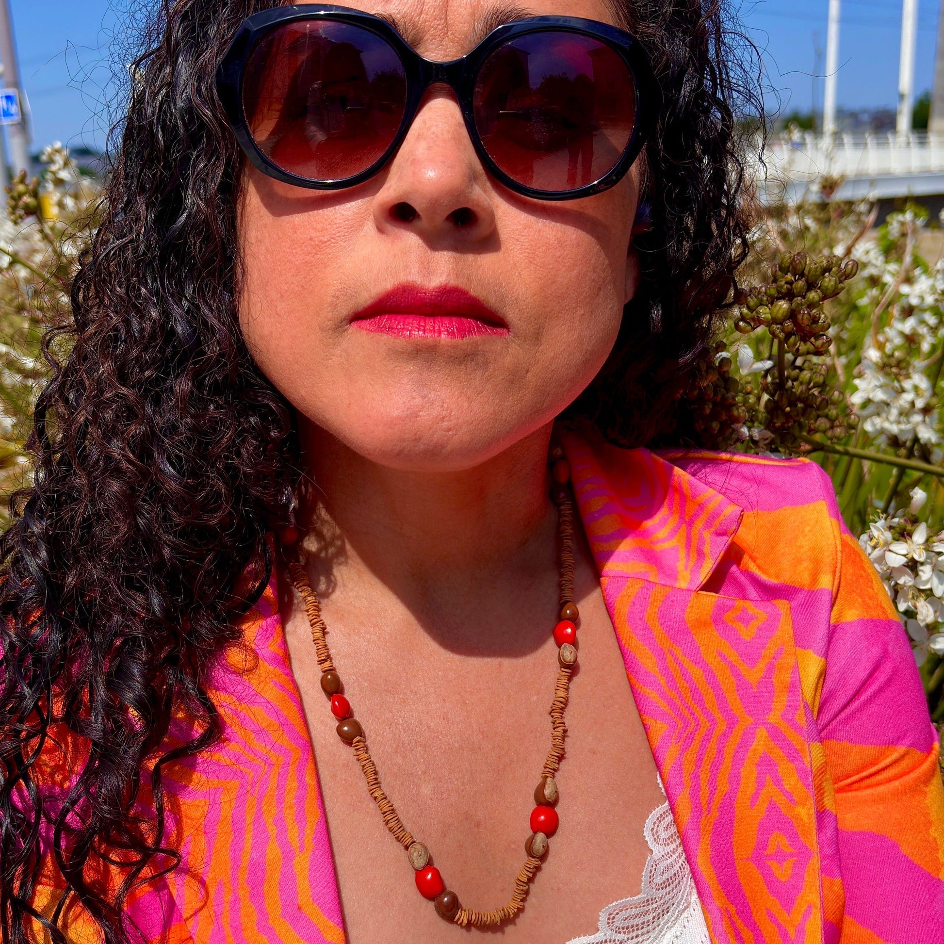 Ce collier est une pièce solaire et authentique. Ses teintes chaudes, inspirées de la forêt amazonienne, rehaussent instantanément un look neutre.