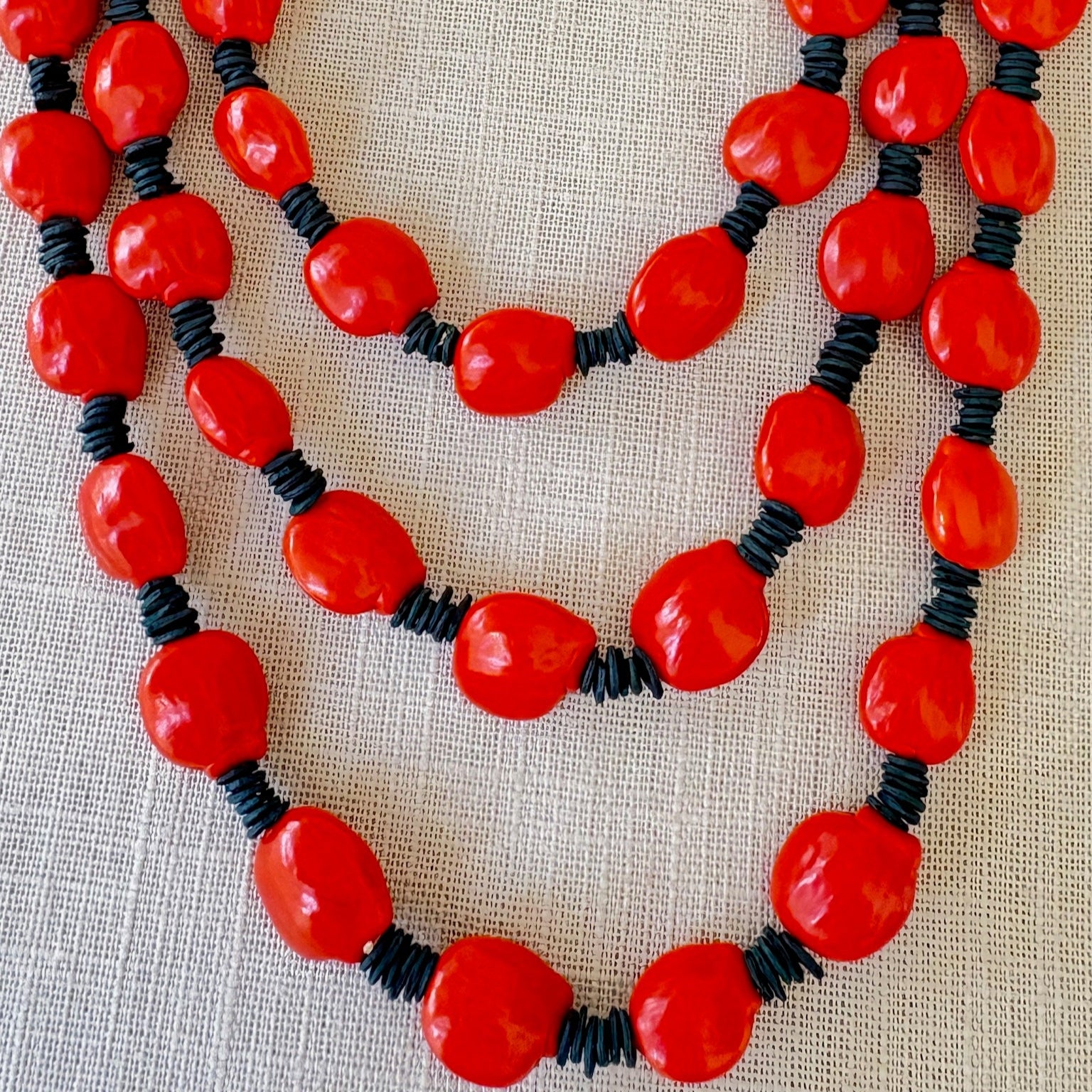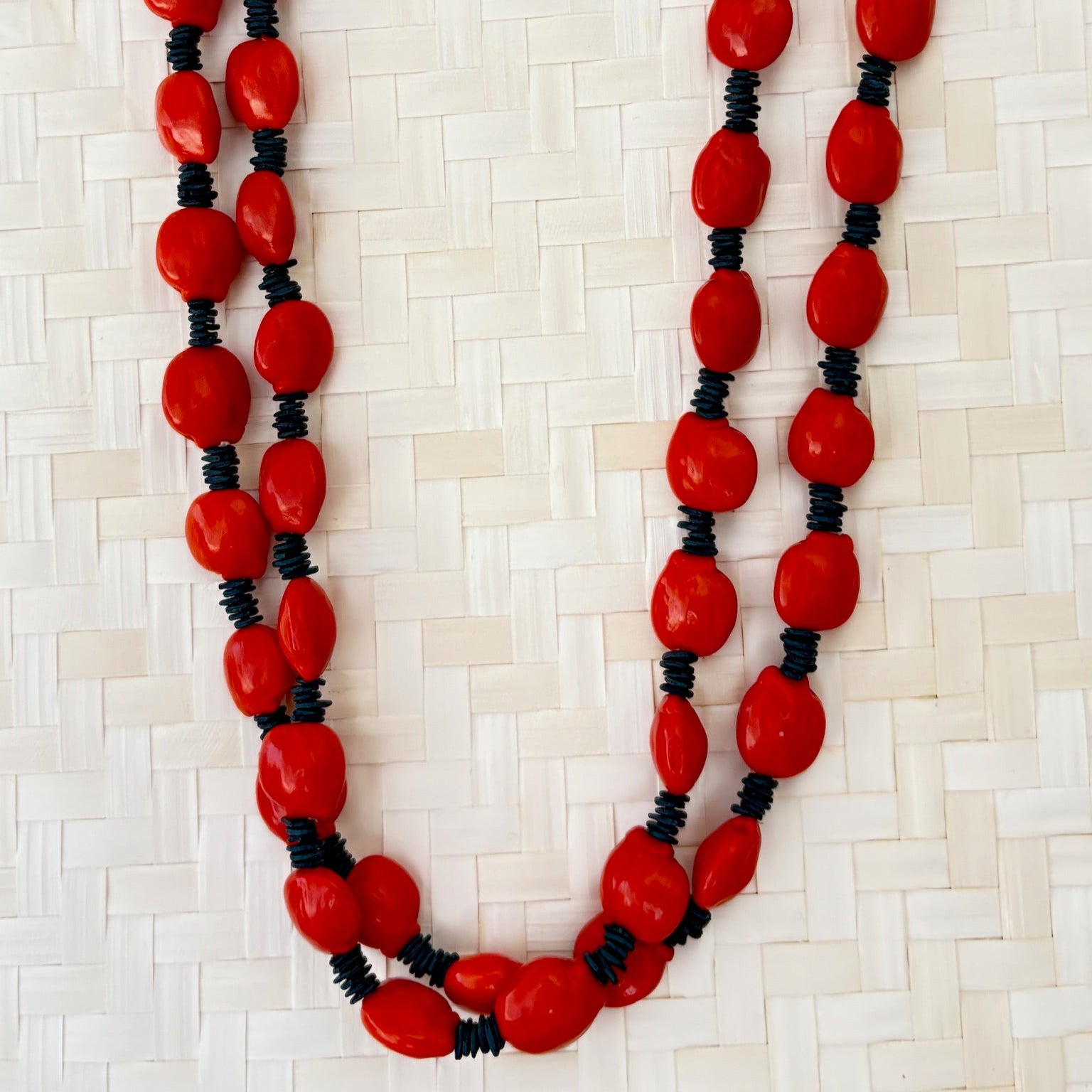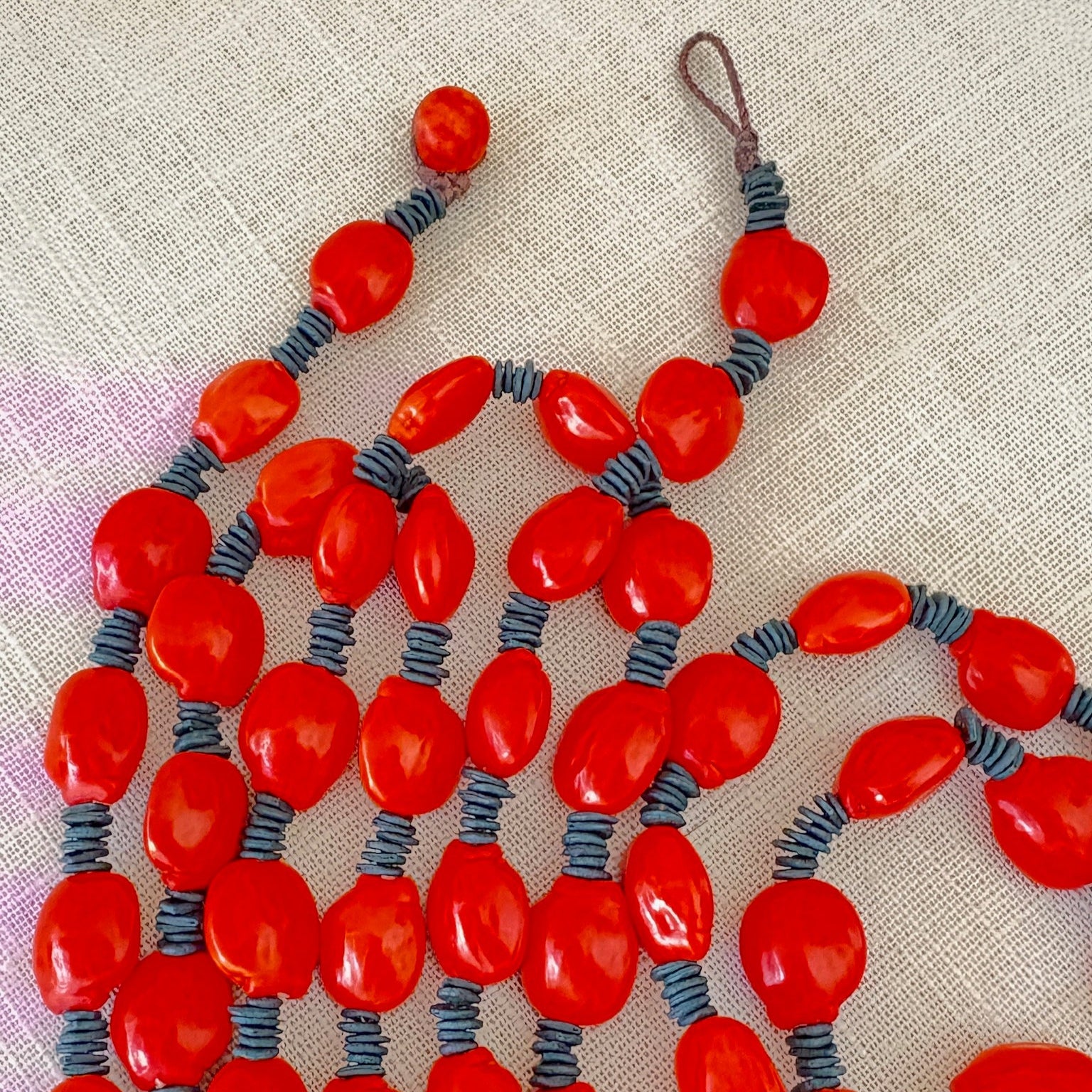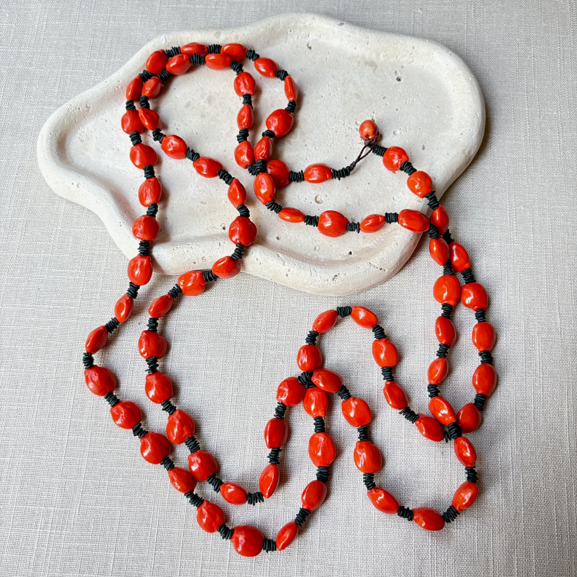 Matériaux : graines naturelles de morototo teintées et de tento