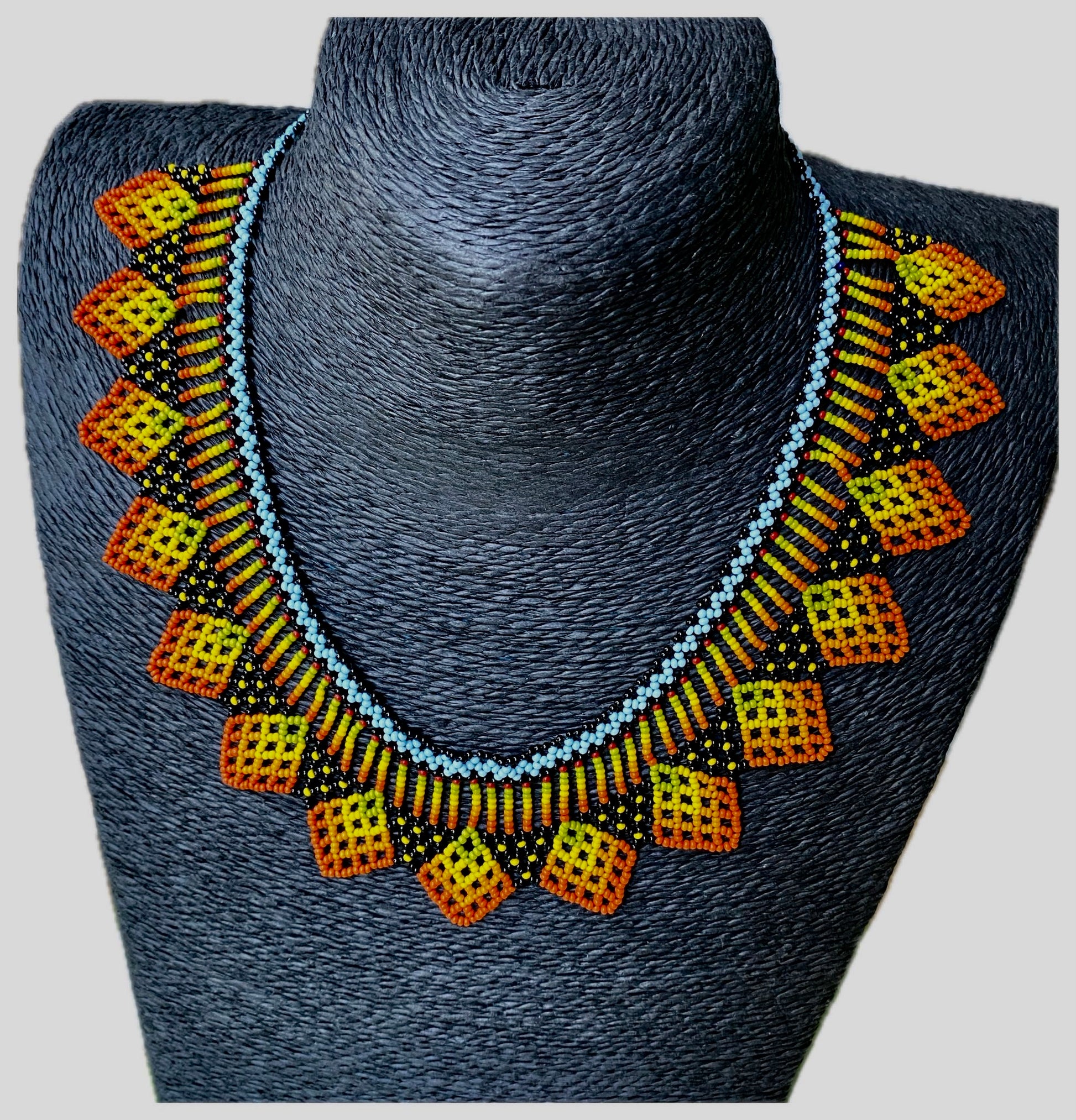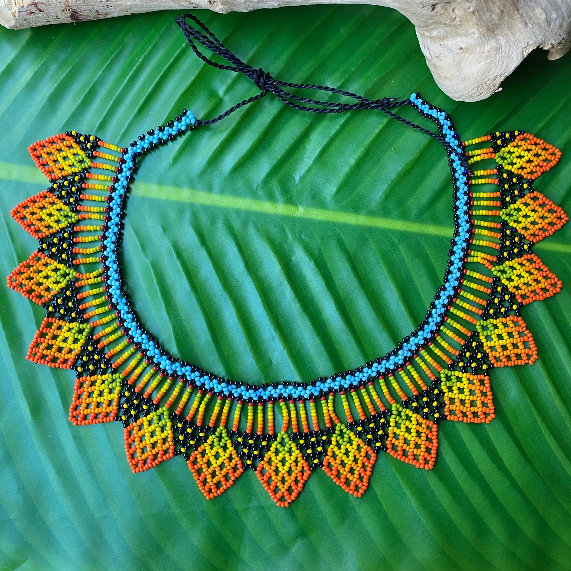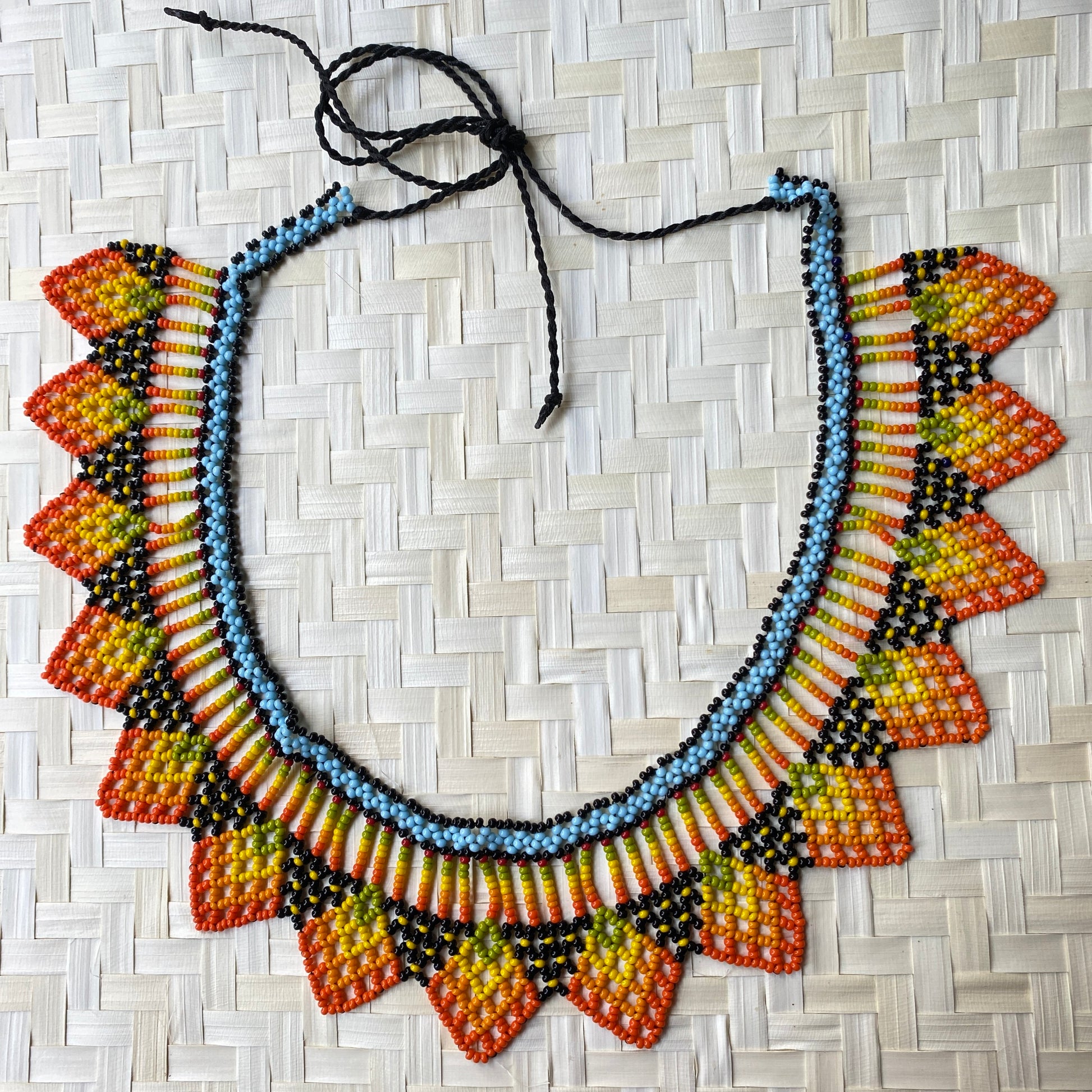 Ce collier met en valeur la ligne du cou avec la ligne noir, tandis que les touches de rouge et de bleu apportent intensité et contraste.