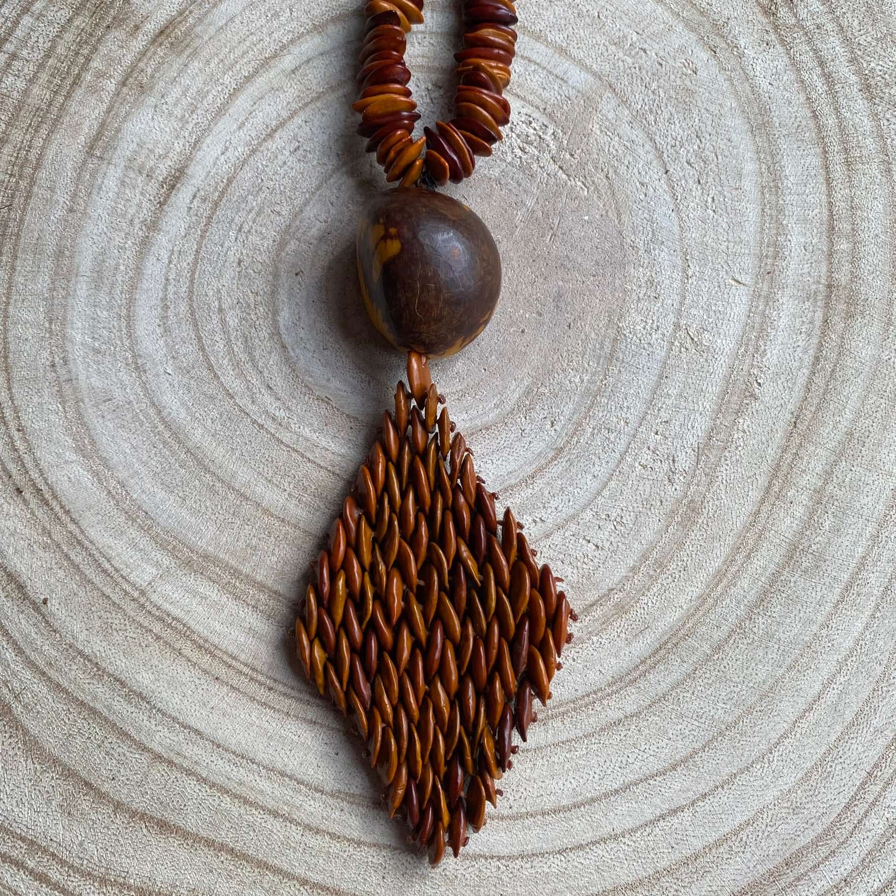 Matériaux : graines naturelles de jueirana teintées et de jarina (ivoire végétal) - Plus d'information sur le jarina.