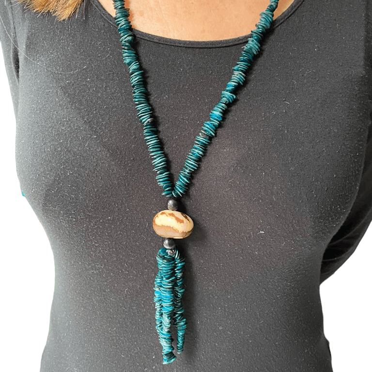 Grâce à son format sautoir, ce collier affine la silhouette et allonge visuellement le buste, tout en mettant en valeur le pendentif naturel.